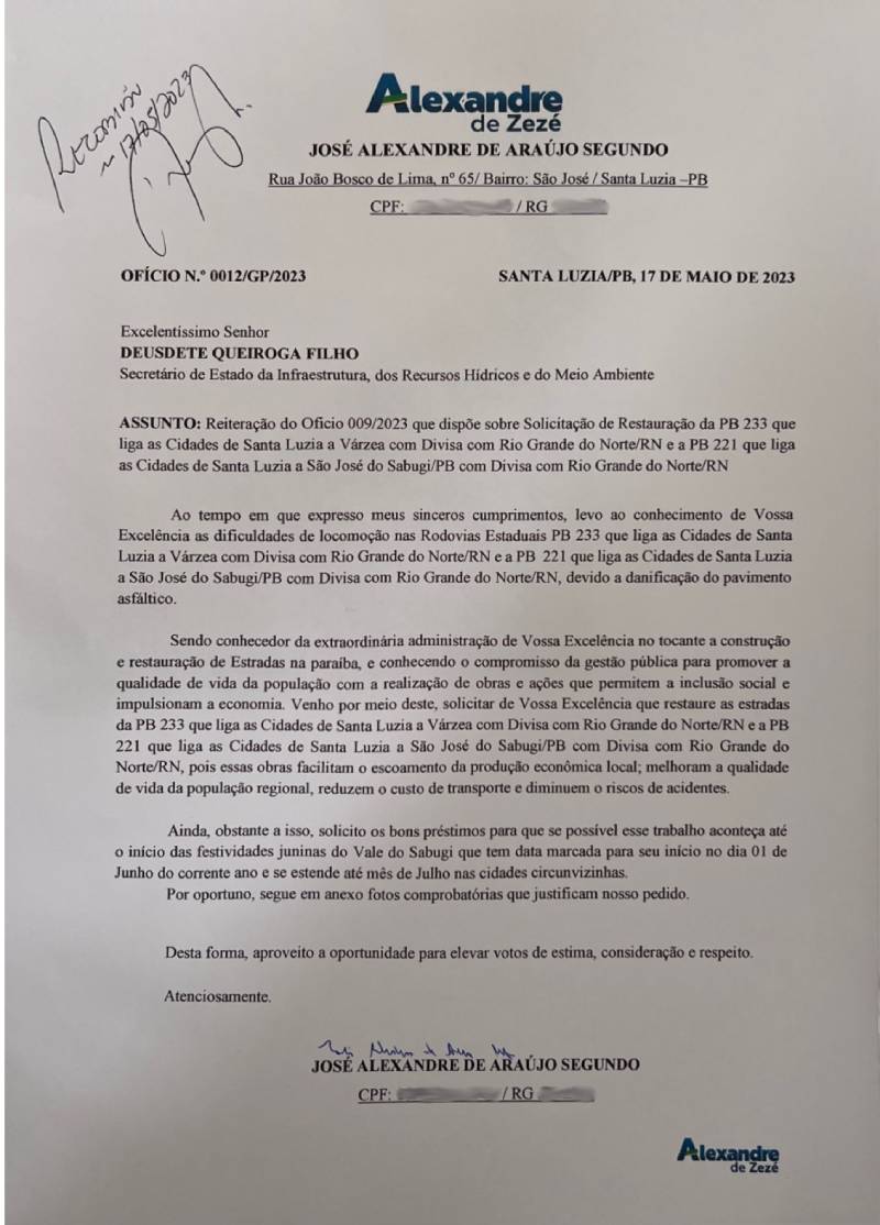 De acordo com ofício encaminhado aos órgãos do Governo do Estado em 17 de maio, Alexandre de Zezé solicitou que as restaurações das duas rodovias ocorressem antes das festividades juninas da região, que se iniciaram no mês de junho, em Santa Luzia, e continuam até o final do mês de julho nas cidades circunvizinhas, a exemplo do São Pedro de São José do Sabugi, concluído neste domingo (9) e da festa de João Pedro, na cidade de Várzea, que ocorrerá entre os dias 14 e 16 deste mês.