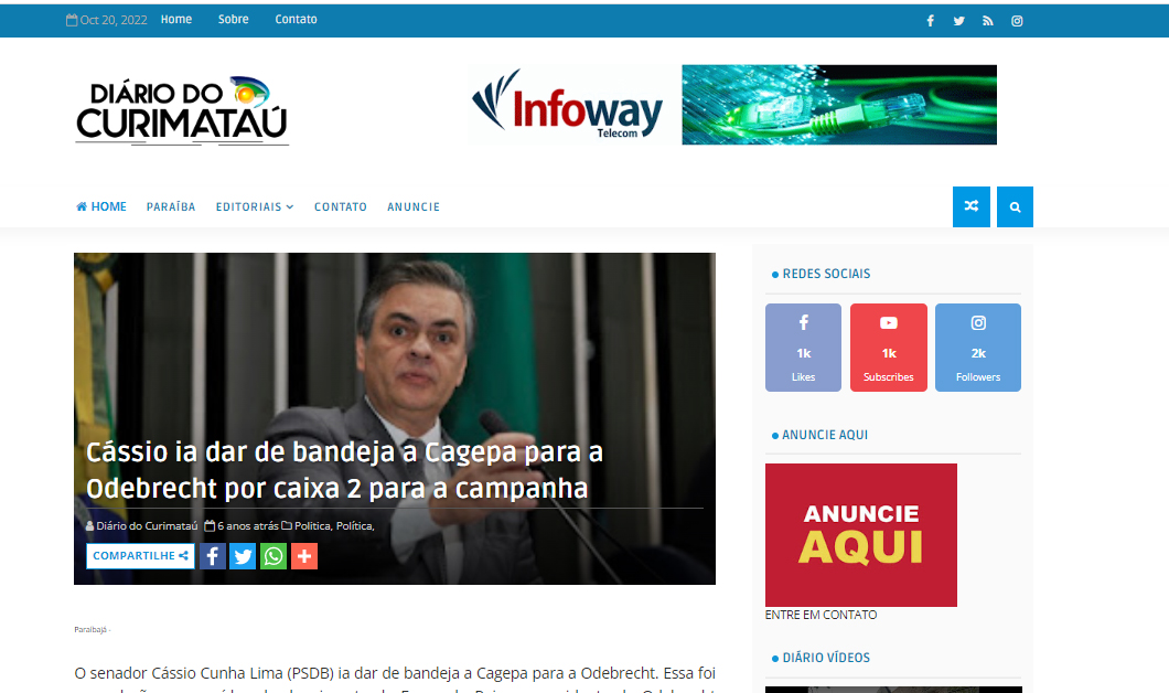 “Nesse caso, a nossa expectativa era que com essa contribuição de R$ 800 mil, que eu autorizei, se, de fato, o senador Cássio Cunha Lima fosse eleito, que ele pudesse levar a gente a esse processo, que é um processo competitivo, que você compete com outras empresas. […] A Paraíba é carente e precisa de investimentos em saneamentos e a gente queria ter a oportunidade de investir lá”, disse Fernando Reis, em delação.