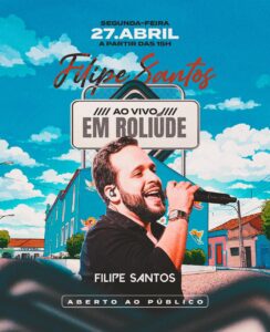 O cantor Filipe Santos escolheu a cidade de Cabaceiras, no Cariri paraibano, para a gravação de seu novo audiovisual. Intitulado “Filipe Santos em Roliúde”, o projeto será registrado no próximo dia 27 de abril, a partir das 15h, no Centro Histórico do município.
