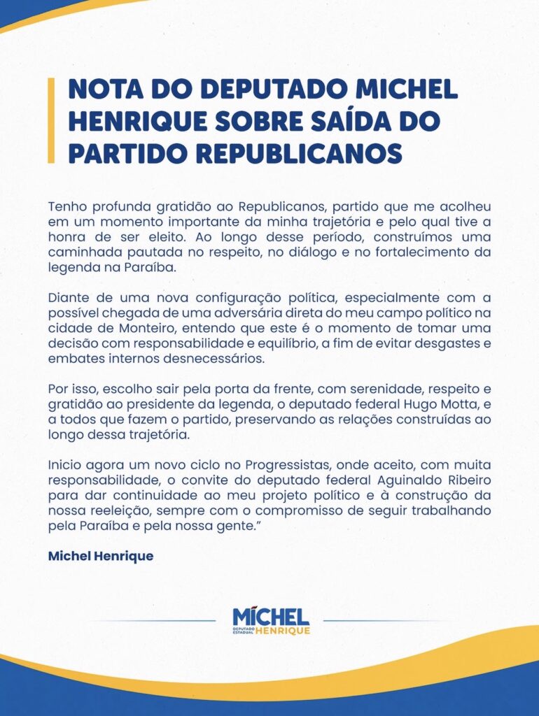 No comunicado, Michel Henrique ressaltou que o Republicanos teve papel fundamental em sua caminhada, especialmente em um momento decisivo de sua vida pública. No entanto, segundo ele, o atual cenário político — marcado por uma nova configuração na cidade de Monteiro, com a possível chegada de uma adversária direta — a ex-prefeita Anna Lorena – exigiu uma postura estratégica para evitar conflitos internos.