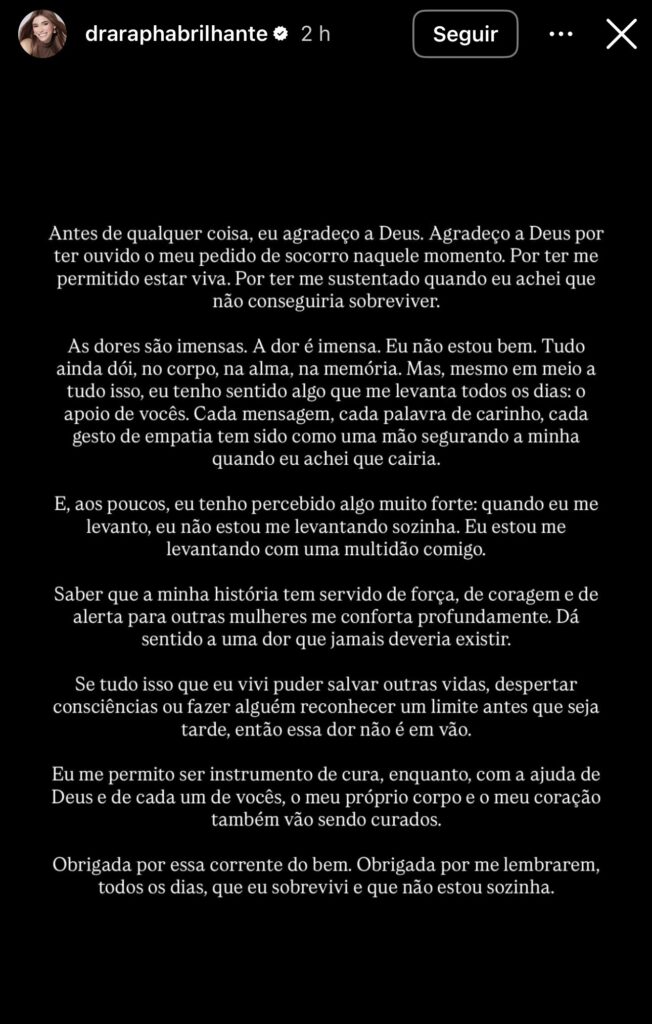 No texto, Raphaella afirma que ainda enfrenta dores intensas “no corpo, na alma e na memória”, e admite que não está bem. Apesar disso, relata que tem encontrado forças no apoio recebido do público, de amigos e de outras mulheres que se identificaram com sua história.